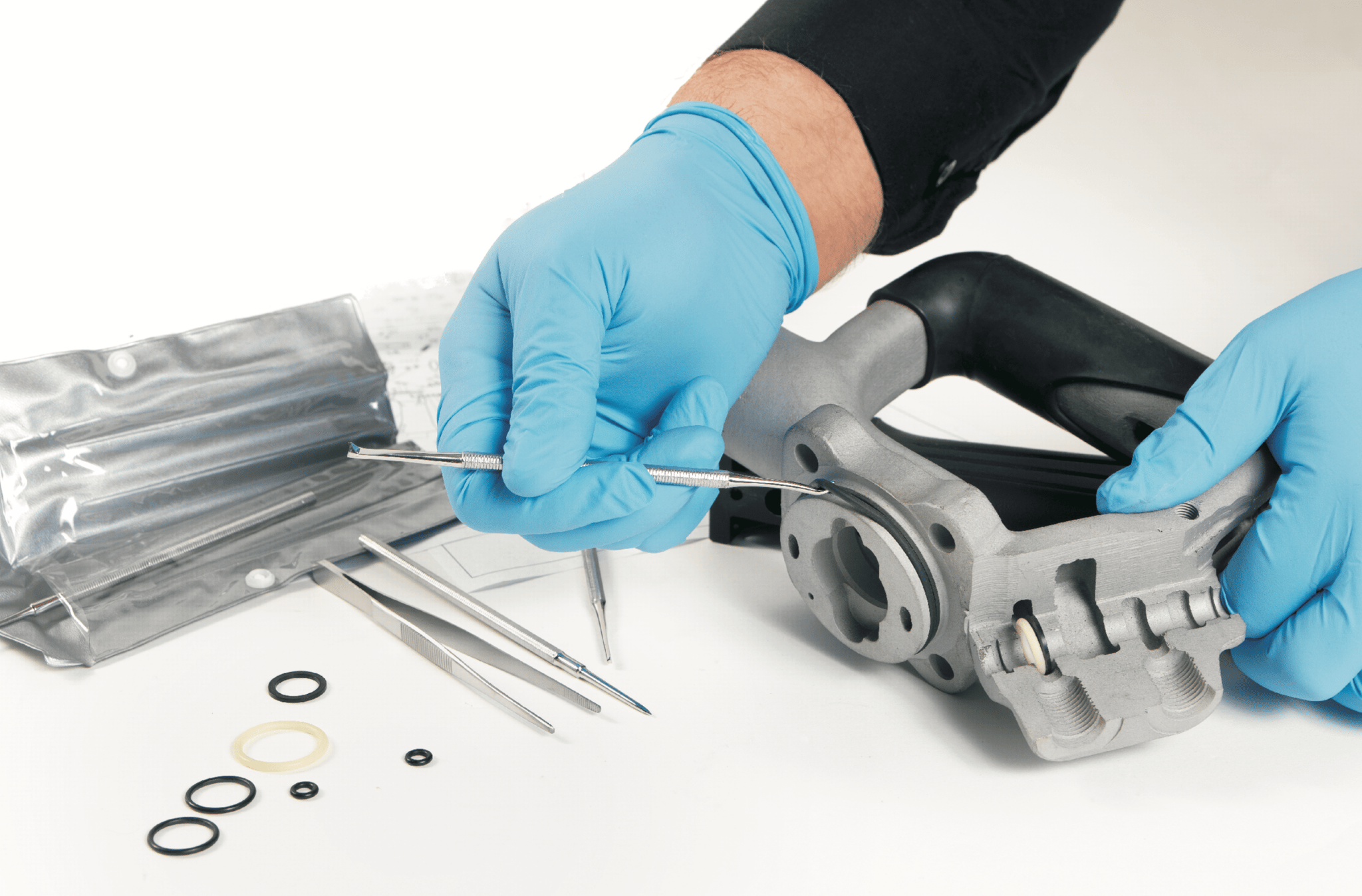 Dichtungs-Zange für die Positionierung von Dichtungen in schwer zugänglichen Einbauräumen. Mit individuell versetzbaren Stiften.